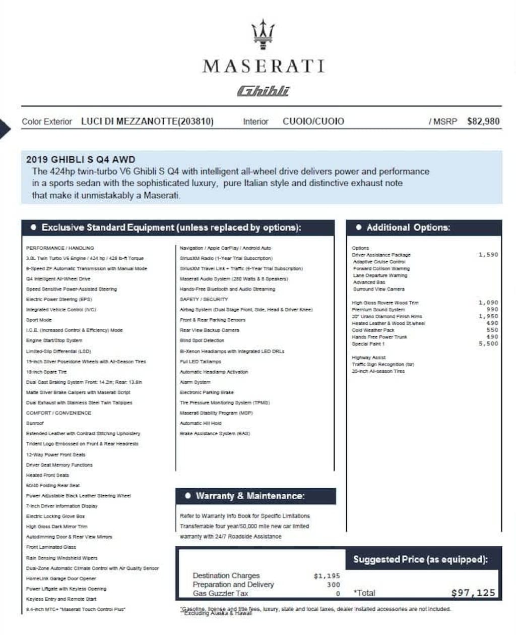 WHEELS: 20 URANO MACHINE POLISHED: Tires: 20, DRIVER ASSISTANCE PACKAGE: Adaptive Cruise Control w/Stop & Go, FCW plus, Active Blind Spot Assist and Lane Keeping Assist, Traffic Sign Recognition, Surround View Camera w/Puddle Lamps, Highway Assist, HIGH GLOSS EBANO WOOD TRIM, harman/kardon 900 WATTS PREMIUM AUDIO SYSTEM: 10 speakers w/subwoofer, CLIMATE PACKAGE: Heated Rear Seats, Heated Windshield Washer Nozzles, Power Rear Sunblind, HEATED SABBIA LEATHER & WOOD STEERING WHEEL, KICK TO OPEN HANDS-FREE POWER TRUNK, LUCI DI MEZZANOTTE, Wireless Phone Connectivity, Led Brakelights, Rear Fog Lamps, Engine Auto Stop-Start Feature, Power Door Locks W/Autolock Feature, Back-Up Camera, Blind Spot Detection Blind Spot, Remote Keyless Entry W/Integrated Key Transmitter, Illuminated Entry And Panic Button, Smart Device Integration, Express Open/Close Sliding And Tilting Glass 1St Row Sunroof W/Sunshade, Cruise Control W/Steering Wheel Controls. Maserati S Q4 with Luci Di Mezzanotte exterior and Cuoio interior features a V6 Cylinder Engine with 424 HP at 5750 RPM*. Reduced from $26,968. This Ghibli is priced $3,100 below Kelley Blue Book.